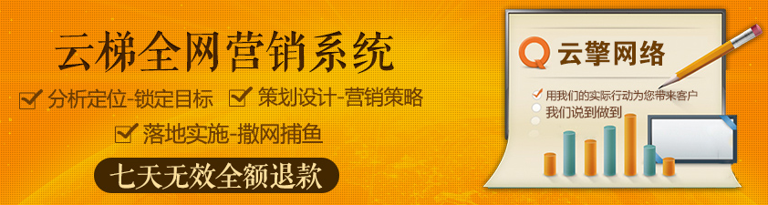 云梯系統(tǒng)為您七步爭奪行業(yè)網(wǎng)絡(luò)營銷霸主,而且公司承諾,網(wǎng)站上線7天無關(guān)鍵詞排名無條件退款,以我們多年的操盤經(jīng)驗和技術(shù)實力為您排憂解難。公司推出包年9800元的包年套餐和3800元/月全新定制套餐(送勾魂營銷型網(wǎng)站)。